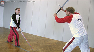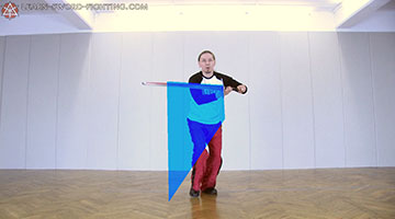 Du selbst hast die Möglichkeit, aus der Bindungsparade gegen den Schaedelhau mit einem Twerhau weiterzuarbeiten (Gegenhau aus der Schaedelhauparade).
