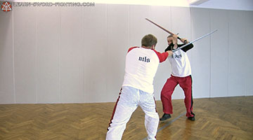 Als Gegenhau aus der Schaedelhauparade eignet sich der Twerhau. Das Video zeigt dir, wie du ihn ausführst. Beachte: Den Twer aus der Bindung musst du nach dem Überführen immer mit der Kurzen Schneide schlagen.