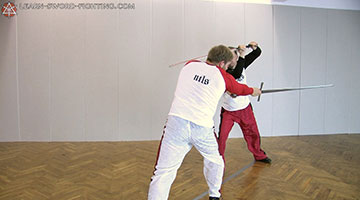 Führst du den Twerhau mit der Langen Schneide aus, provozierst du den Gegenbruch zu deinem Twerhau aus der Bindung: das Henddruecken, denn beim Twer mit der Langen Schneide drehen sich deine Hände direkt in die Schneide der gegnerischen Klinge.