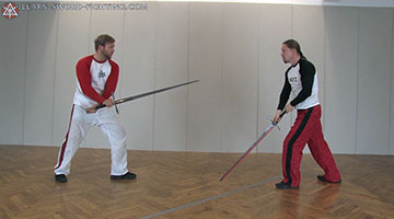 In this exercise, which is a simple extension of the Measure Game, you change guards with every step. So you must be simultaneously aware of your partners steps and of the position of your sword at all times.