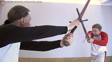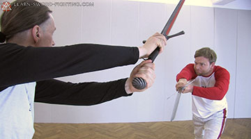 Die Angriffserweiterung Durchwechseln kommt zur Anwendung, wenn der Gegner unseren Angriff (Zornhau oder Unterhau) passiv versetzt: Der Ort zeigt zum Boden und bedroht uns also nicht. Das Durchwechseln funktioniert ebenfalls als Angriffserweiterung, wenn du mit einem Mittelhau angegriffen hast.