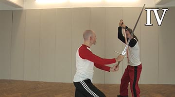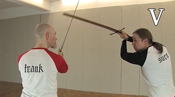 Und wenn du vor deinen Mann kommst / und durch Aufstreichen oder Aufziehen zu einem Oberhau mit deinem Schwert in die Höhe gekommen bist / und er haut dir währendessen von deiner Linken zum Kopf / so spring aus dem Hau nach seiner Linken / etwas zu ihm um / und schlag mit auswendiger Fläche gegen seinen herfliegenden Streich / so dass du sein Schwert in der Stärke triffst / und das stark / so dass sich der vordere Teil deiner Klinge über seinem Schwert zu seinem Kopf einschwingt / was dann gewiss trifft / wenn du gleichzeitig mit ihm schlägst / und mit deinem Schwert oberhalb des seinen kommst auf solchen Hau er habe getroffen oder nicht / so zucke dein Schwert wieder über sich ab / und haue übereck dagegen über / von unten zu seinem rechten Arm / in solchem Hau tritt mit deinem linken Fuß wohl gegen seiner Rechten / und bücke dich mit deinem Kopf wohl hinter die Klinge deines Schwertes / von dort zucke behende wieder über dich / und winke ihm mit der kurzen Schneide tief zu seinem linken Ohr / siehst du dass er nachwischt / so lasse ihn nicht treffen sonden fehl ablaufen /und verschränke bald deine Hände in der Luft (die Rechte über die Linke) und schlag ihm mit der kurzen Schneide tief zu seinem rechten Ohr / als bald zwirch um und zieh ab