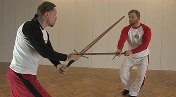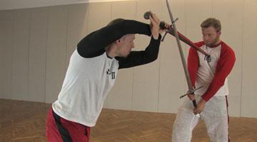 Wenn du in der Hut Ochs liegst und der Gegner dich in diesem Leger angreift, indem er deine Klinge anzubinden versucht, dann ist das in diesem Video gezeigte Winden in die oberen Blößen des Gegners als Konter gut geeignet.