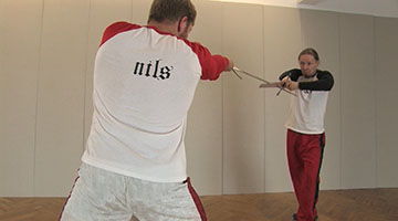Das Winden in die unteren Blößen eignet sich als Konter gegen Fechter, die gerne Stiche zum Kopf oder zur Brust führen. In diesem Video werden die oberen Ziele vom Gegner mit einem hohen Stich angegriffen.