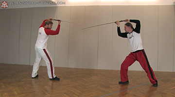 In this exercise, which is a simple extension of the Measure Game, you change guards with every step. So you must be simultaneously aware of your partners steps and of the position of your sword at all times.